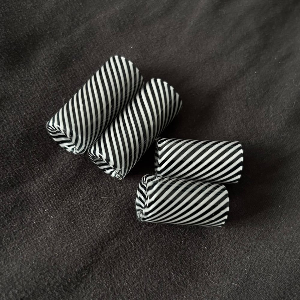 Black & White Spiraled Boot-Beads! Can be used with any laced-shoes, hoodie drawstrings, as dreadbeads, on necklaces or anywhere else you can think of safely using these! Flame polished on both sides.